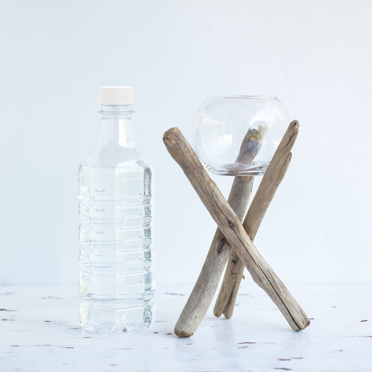 テーブルなどと接する脚部の先端や流木とガラスボールの接地面には滑り止めとなるワックスを塗布するなどして転倒しづらい工夫をしています。